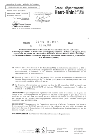 portant autorisation du transfert de l'autorisation relative au service d'accompagnement à la vie sociale (SAVS) pour personnes adultes handicapées, d'une capacité de 45 places, de l'association solidarité du Rhin médico-social (ASRMS) à NEUF-BRISACH vers