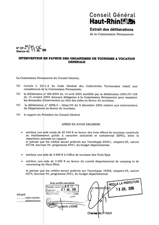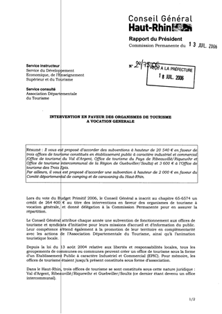 Il vous est proposé d’accorder des subventions à hauteur de 20 540 € en faveur de trois offices de tourisme constitués en établissement public à caractère industriel et commercial (Office de tourisme du Val d’Argent, Office de tourisme du Pays de Ribeauvillé/Riquewihr et Office de tourisme intercommunal de la Région de Guebwiller/Soultz) et 3 600 € à l’Office de tourisme des Trois Epis. Par ailleurs, il vous est proposé d’accorder une subvention à hauteur de 2 000 € en faveur du Comité départemental de camping et de caravaning du Haut-Rhin.