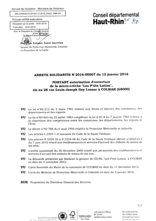 portant autorisation d'ouverture de la micro-crèche "les P'tits Lutins", sis au 28 rue Louis-Joseph Gay à COLMAR (68000) Resumé Pièces jointes ARRETE Assemblée : Non défini Date : 12/01/2016 Rapporteur : Non défini Collectivité : Conseil départemental du Haut-Rhin Direction : Non défini Service : Direction Enfance Santé Insertion Domaine : Accueil d'enfants Commission :