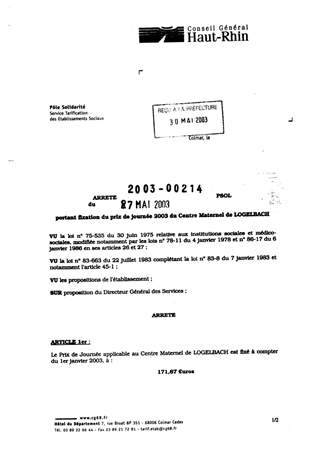 portant fixation du prix de journée 2003 du centre maternel de Logelbach Resumé Pièces jointes ARRETE Assemblée : Non défini Date : 27/05/2003 Rapporteur : Non défini Collectivité : Conseil départemental du Haut-Rhin Direction : Non défini Service : Service de la Tarification des Etablissements Domaine : Prix de Journée Commission :