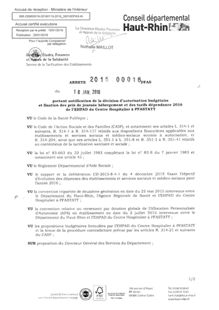 portant notification de la décision d'autorisation budgétaire et fixation des prix de journée hébergement et des tarifs dépendance 2016 de l'EHPAD du centre hospitalier à PFASTATT Resumé Pièces jointes ARRETE Assemblée : Non défini Date : 18/01/2016 Rapporteur : Non défini Collectivité : Conseil départemental du Haut-Rhin Direction : Non défini Service : Direction Etudes, Finances et Appuis de la Solidarité Domaine : Prix de Journée Commission :