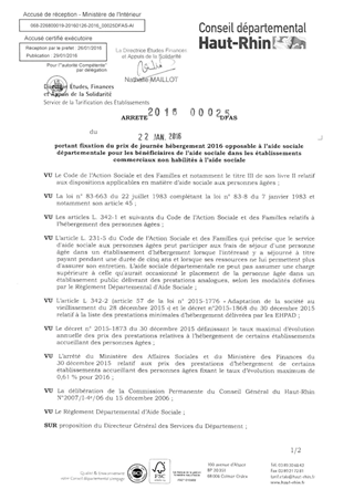 portant fixation du prix de journée hébergement 2016 opposable à l'aide sociale départementale pour les bénéficiaires de l'aide sociale dans les établissements commerciaux non habilités à l'aide sociale Resumé Pièces jointes ARRETE Assemblée : Non défini Date : 22/01/2016 Rapporteur : Non défini Collectivité : Conseil départemental du Haut-Rhin Direction : Non défini Service : Direction Etudes, Finances et Appuis de la Solidarité Domaine : Prix de Journée Commission :