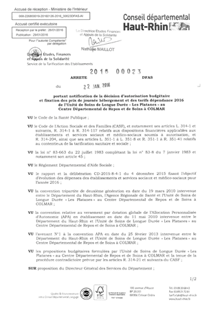 portant notification de la décision d'autorisation budgétaire et fixation des prix de journée hébergement et des tarifs dépendance 2016 de l'Unité de Soins de Longue Durée "Les Platanes" au centre départemental de repos et de soins à COLMAR Resumé Pièces jointes ARRETE Assemblée : Non défini Date : 22/01/2016 Rapporteur : Non défini Collectivité : Conseil départemental du Haut-Rhin Direction : Non défini Service : Direction Etudes, Finances et Appuis de la Solidarité Domaine : Prix de Journée Commission :
