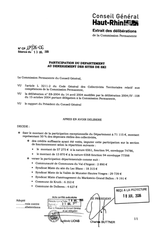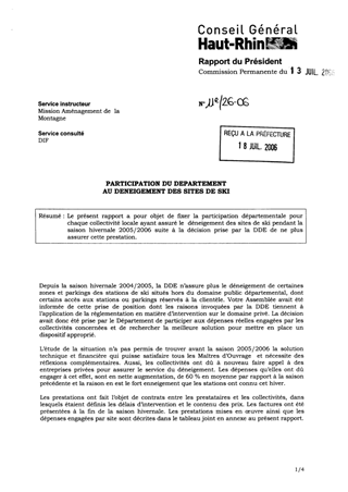 Le présent rapport a pour objet de fixer la participation départementale pour chaque collectivité locale ayant assuré le déneigement des sites de ski pendant la saison hivernale 2005/2006 suite à la décision prise par la DDE de ne plus assurer cette prestation.