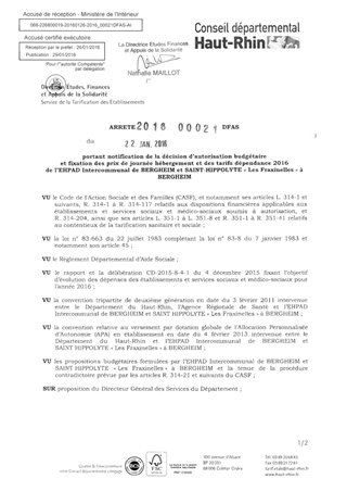 portant notification de la décision d'autorisation budgétaire et fixation des prix de journée hébergement et des tarifs dépendance 2016 de l'EHPAD Intercommune de BERGHEIM et SAINT-HIPPOLYTE "Les Fraxinelles" à BERGHEIM Resumé Pièces jointes ARRETE Assemblée : Non défini Date : 22/01/2016 Rapporteur : Non défini Collectivité : Conseil départemental du Haut-Rhin Direction : Non défini Service : Direction Etudes, Finances et Appuis de la Solidarité Domaine : Prix de Journée Commission :