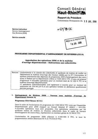 Conformément à la volonté des collectivités et syndicats de rivières de confier au Département la maîtrise d’ouvrage des travaux validés par la 6ème Commission, le montant prévisionnel des dépenses du programme 2006 d’aménagement des cours d’eau à réaliser par le Département s’élève à 4 000 000 € TTC. Il vous est proposé d’approuver 4 nouvelles opérations pour un montant total de 52 960 € TTC et la maîtrise d’ouvrage départementale. 11 opérations subventionnables sont également à inscrire pour un montant de subvention de 104 441,20 € et une opération tombée en déchéance quadriennale doit être prorogée.