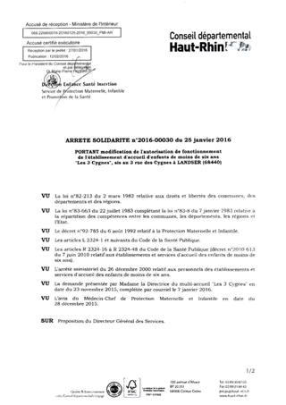 portant modification de l'autorisation de fonctionnement de l'établissement d'accueil d'enfants de moins de six ans "Les 3 Cygnes", sis au 3 rue des Cygnes à LANDSER (68440) Resumé Pièces jointes ARRETE Assemblée : Non défini Date : 25/01/2016 Rapporteur : Non défini Collectivité : Conseil départemental du Haut-Rhin Direction : Non défini Service : Direction Enfance Santé Insertion Domaine : Accueil d'enfants Commission :