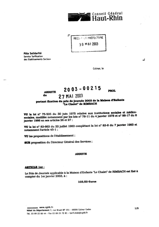 portant fixation du prix de journée 2003 de la Maison d'Enfants "Le Châlet" de RIMBACH. Resumé Pièces jointes ARRETE Assemblée : Non défini Date : 27/05/2003 Rapporteur : Non défini Collectivité : Conseil départemental du Haut-Rhin Direction : Non défini Service : Service de la Tarification des Etablissements Domaine : Prix de Journée Commission :