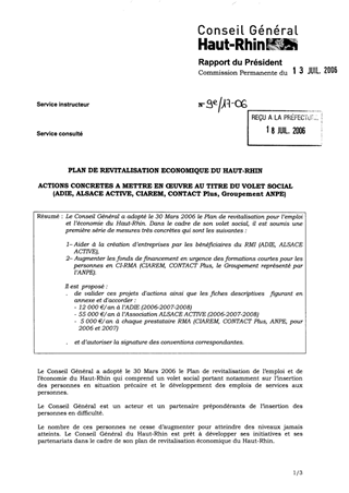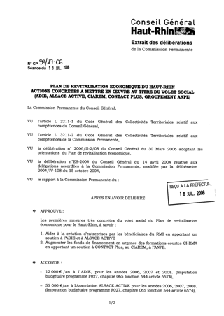Le Conseil Général a adopté le 30 Mars 2006 le Plan de revitalisation pour l’emploi et l’économie du Haut-Rhin. Dans le cadre de son volet social, il est soumis une première série de mesures très concrètes qui sont les suivantes : 1– Aider à la création d’entreprises par les bénéficiaires du RMI (ADIE, ALSACE ACTIVE), 2– Augmenter les fonds de financement en urgence des formations courtes pour les personnes en CI-RMA (CIAREM, CONTACT Plus, le Groupement représenté par l’ANPE).