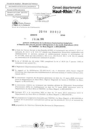 portant notification de la décision d'autorisation budgétaire et fixation des prix de journée hébergement et des tarifs dépendance 2016 de l'EHPAD "Le Beau Regard" à MULHOUSE Resumé Pièces jointes ARRETE Assemblée : Non défini Date : 28/01/2016 Rapporteur : Non défini Collectivité : Conseil départemental du Haut-Rhin Direction : Non défini Service : Direction Etudes, Finances et Appuis de la Solidarité Domaine : Prix de Journée Commission :