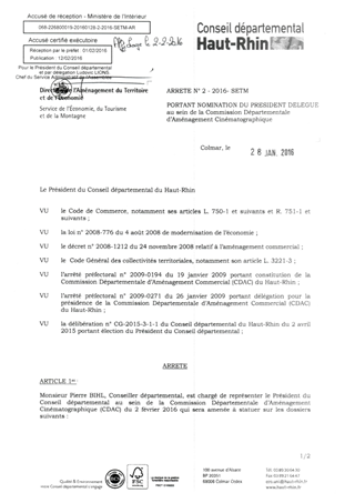portant nomination du Président délégué au sein de la Commission Départementale d'Aménagement Cinématographique Resumé Pièces jointes ARRETE Assemblée : Non défini Date : 28/01/2016 Rapporteur : Non défini Collectivité : Conseil départemental du Haut-Rhin Direction : Non défini Service : Direction de l'Aménagement du Territoire et de l'Economie Domaine : Autres (non classés) Commission :