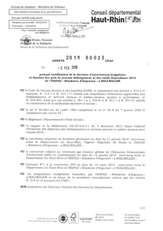 portant notification de la décision d'autorisation budgétaire et fixation des prix de journée hébergement et des tarifs dépendance 2016 de l'EHPAD "Résidence d'Argenson" à BOLLWILLER Resumé Pièces jointes ARRETE Assemblée : Non défini Date : 02/02/2016 Rapporteur : Non défini Collectivité : Conseil départemental du Haut-Rhin Direction : Non défini Service : Direction Etudes, Finances et Appuis de la Solidarité Domaine : Prix de Journée Commission :