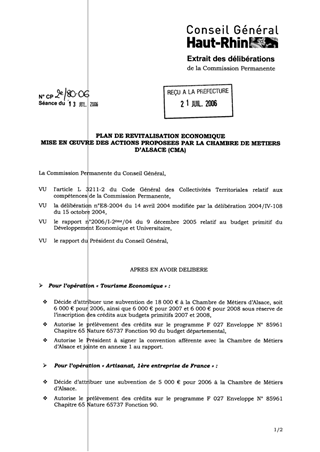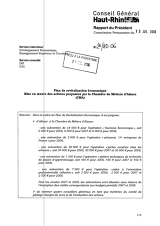 Dans le cadre du Plan de Revitalisation Economique, il est proposé :  d’allouer à la Chambre de Métiers d’Alsace : - une subvention de 18 000 € pour l’opération « Tourisme Economique », soit 6 000 € pour 2006, 6 000 € pour 2007 et 6 000 € pour 2008, - une subvention de 5 000 € pour l’opération « artisanat, 1ère entreprise de France » pour 2006, - une subvention de 90 000 € pour l’opération « portes ouvertes chez les artisans », soit 30 000 € pour 2006, 30 000 € pour 2007 et 30 000 € pour 2008, - une subvention de 1 350 € pour l’opération « ateliers techniques de recherche de places d’apprentissage, soit 450 € pour 2006, 450 € pour 2007 et 450 € pour 2008, - une subvention de 7 500 € pour l’opération « aides à l’orientation professionnelle collective », soit 2 500 € pour 2006, 2 500 € pour 2007 et 2 500 € pour 2008. Pour les années 2007 et 2008, les subventions sont allouées sous réserve de l’inscription des crédits correspondants aux budgets primitifs 2007 et 2008.  de nommer quatre conseillers généraux en tant que membres du comité de pilotage chargés du suivi et de l’évaluation des actions.