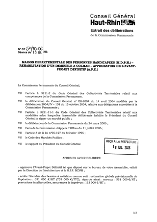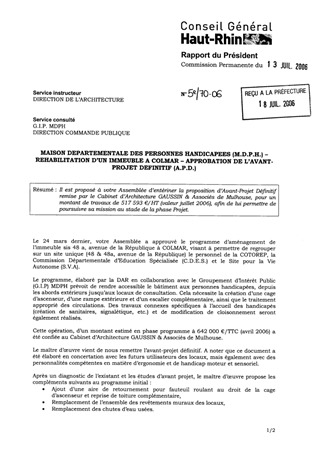 L’objectif de ce rapport est l’approbation par votre Commission du programme définitif concernant la réhabilitation d’un immeuble sis 48a, avenue de la République à COLMAR, aux fins d’y installer les services de la Maison Départementale des Personnes Handicapées. Le montant de cette opération est estimé à 642 000 €/TTC.