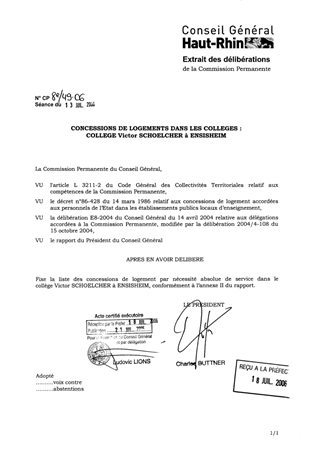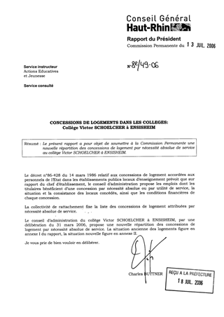 Le présent rapport a pour objet de soumettre à la Commission Permanente une nouvelle répartition des concessions de logement par nécessité absolue de service au collège Victor SCHOELCHER à ENSISHEIM.