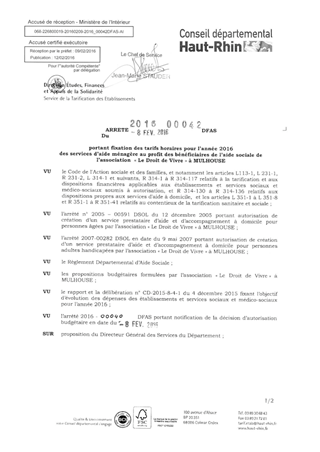 portant fixation des tarifs horaires pour l'année 2016 des services d'aide ménagère au profit des bénéficiaires de l'aide sociale de l'association "Le Droit de Vivre" à MULHOUSE Resumé Pièces jointes ARRETE Assemblée : Non défini Date : 08/02/2016 Rapporteur : Non défini Collectivité : Conseil départemental du Haut-Rhin Direction : Non défini Service : Direction Etudes, Finances et Appuis de la Solidarité Domaine : Prix de Journée Commission :