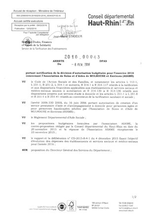 portant notification de la décision d'autorisation budgétaire pour l'exercice 2016 concernant l'association de soins et d'aides de MULHOUSE et Environs (ASAME) Resumé Pièces jointes ARRETE Assemblée : Non défini Date : 08/02/2016 Rapporteur : Non défini Collectivité : Conseil départemental du Haut-Rhin Direction : Non défini Service : Direction Etudes, Finances et Appuis de la Solidarité Domaine : Dotations financières Commission :