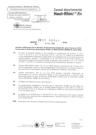 portant notification de la décision d'autorisation budgétaire pour l'exercice 2016 concernant la fédération Association d'Aide en Milieu Rural (ADMR) du Haut-Rhin Resumé Pièces jointes ARRETE Assemblée : Non défini Date : 08/02/2016 Rapporteur : Non défini Collectivité : Conseil départemental du Haut-Rhin Direction : Non défini Service : Direction Etudes, Finances et Appuis de la Solidarité Domaine : Dotations financières Commission :