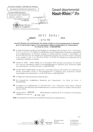 portant fixation du tarif horaire du service d'aide et d'accompagnement à domicile pour les personnes âgées et les personnes adultes handicapées de l'association "Le Droit de Vivre" à MULHOUSE Resumé Pièces jointes ARRETE Assemblée : Non défini Date : 08/02/2016 Rapporteur : Non défini Collectivité : Conseil départemental du Haut-Rhin Direction : Non défini Service : Direction Etudes, Finances et Appuis de la Solidarité Domaine : Personnes Agées Commission :