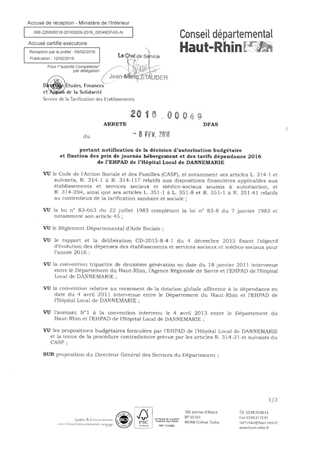portant notification de la décision d'autorisation budgétaire et fixation des prix de journée hébergement et des tarifs dépendance 2016 de l'EHPAD de l'hôpital local de DANNEMARIE Resumé Pièces jointes ARRETE Assemblée : Non défini Date : 08/02/2016 Rapporteur : Non défini Collectivité : Conseil départemental du Haut-Rhin Direction : Non défini Service : Direction Etudes, Finances et Appuis de la Solidarité Domaine : Prix de Journée Commission :