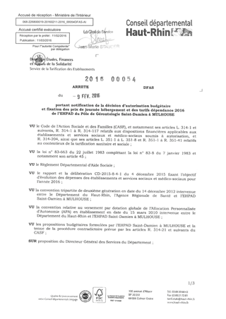portant notification de la décision d'autorisation budgétaire et fixation des prix de journée hébergement et des tarifs dépendance 2016 de l'EHPAD du pôle de gérontologie Saint-Damien à MULHOUSE Resumé Pièces jointes ARRETE Assemblée : Non défini Date : 09/02/2016 Rapporteur : Non défini Collectivité : Conseil départemental du Haut-Rhin Direction : Non défini Service : Direction Etudes, Finances et Appuis de la Solidarité Domaine : Prix de Journée Commission :