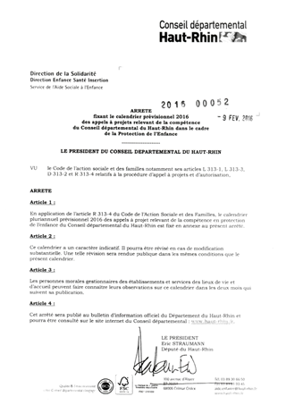fixant le calendrier prévisionnel 2016 des appels à projets relevant de la compétence du Conseil départemental du Haut-Rhin dans le cadre de la Protection de l'Enfance Resumé Pièces jointes ARRETE Assemblée : Non défini Date : 09/02/2016 Rapporteur : Non défini Collectivité : Conseil départemental du Haut-Rhin Direction : Non défini Service : Direction Enfance Santé Insertion Domaine : Autres (non classés) Commission :