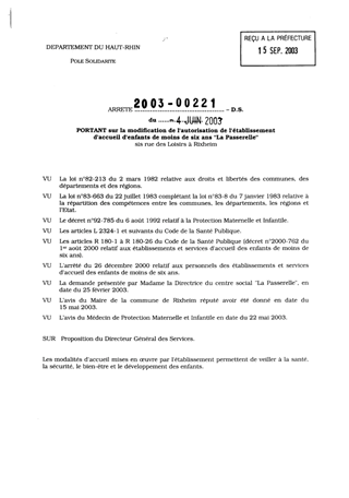 portant sur la modification de l'autorisation de l'établissement d'accueil d'enfants de moins de six ans "La Passerelle" sis rue des Loisirs à RIXHEIM. Resumé Pièces jointes ARRETE Assemblée : Non défini Date : 04/06/2003 Rapporteur : Non défini Collectivité : Conseil départemental du Haut-Rhin Direction : Non défini Service : Direction de la Solidarité Domaine : Accueil d'enfants Commission :