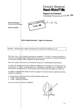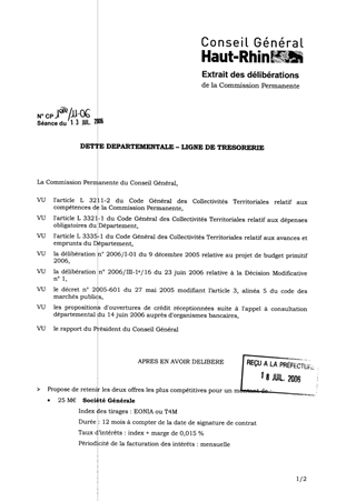 Dette départementale. Ligne de trésorerie Resumé Ouverture d'un crédit à court terme d'un montant de 45 M€ pour un an. Pièces jointes DELIBERATION RAPPORT Assemblée : Commission Permanente Date : 13/07/2006 Rapporteur : Non défini Collectivité : Conseil départemental du Haut-Rhin Direction : Non défini Service : Direction des Finances Domaine : Urbanisme Commission : Commission Permanente