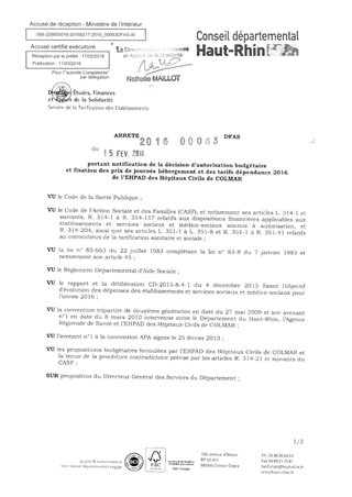 portant notification de la décision d'autorisation budgétaire et fixation des prix de journée hébergement et des tarifs dépendance 2016 de l'EHPAD des hôpitaux civils de COLMAR Resumé Pièces jointes ARRETE Assemblée : Non défini Date : 15/02/2016 Rapporteur : Non défini Collectivité : Conseil départemental du Haut-Rhin Direction : Non défini Service : Direction Etudes, Finances et Appuis de la Solidarité Domaine : Prix de Journée Commission :