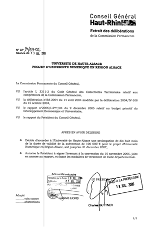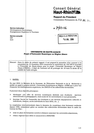 Dans le cadre du présent rapport, il est proposé la passation d’un avenant à la convention du 10 novembre 2005 concernant la subvention de 100 000 € accordée à l’Université de Haute-Alsace pour le projet « Université Numérique en Région Alsace (UNERA) ». L’objet de l’avenant est de prolonger de 18 mois la durée de la validité de l’aide octroyée.