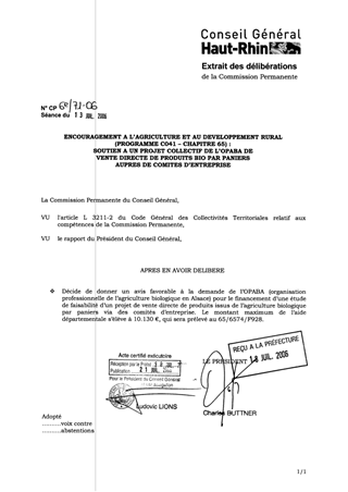 Encouragement à l'agriculture et au développement rural (programme C041-chapitre 65). Soutien à un projet collectif de l'OBAPA de vente directe de produits bio par paniers auprès de comités d'entreprise