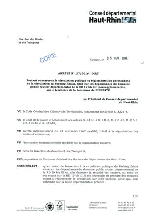 portant ouverture à la circulation publique et réglementation permenante de la circulation du parking relais, situé sur les dépendances du domaine public routier départemental de la RD 19 bis III, hors agglomération, sur le territoire de la commune de SIE