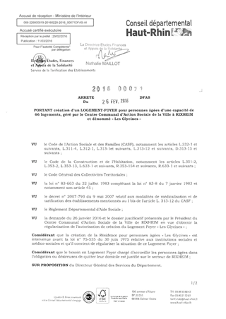 portant création d'un logement-foyer pour personnes âgées d'une capacité de 66 logements, géré par le centre communal d'action sociale de la ville à RIXHEIM et dénommé "Les Glycines" Resumé Pièces jointes ARRETE Assemblée : Non défini Date : 26/02/2016 Rapporteur : Non défini Collectivité : Conseil départemental du Haut-Rhin Direction : Non défini Service : Direction Etudes, Finances et Appuis de la Solidarité Domaine : Personnes Agées Commission :
