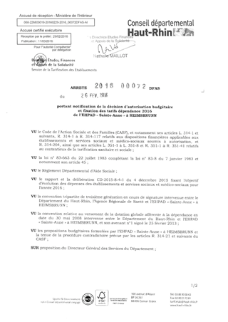portant notification de la décision d'autorisation budgétaire et fixation des tarifs dépendance 2016 de l'EHPAD "Sainte-Anne" à HEIMSBRUNN Resumé Pièces jointes ARRETE Assemblée : Non défini Date : 26/02/2016 Rapporteur : Non défini Collectivité : Conseil départemental du Haut-Rhin Direction : Non défini Service : Direction Etudes, Finances et Appuis de la Solidarité Domaine : Dotations financières Commission :