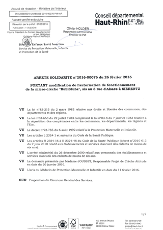 portant modification de l'autorisation de fonctionnement de la micro-crèche "BubiStuba", sis au 3 rue d'Alsace à SIERENTZ Resumé Pièces jointes ARRETE Assemblée : Non défini Date : 26/02/2016 Rapporteur : Non défini Collectivité : Conseil départemental du Haut-Rhin Direction : Non défini Service : Direction Enfance Santé Insertion Domaine : Accueil d'enfants Commission :