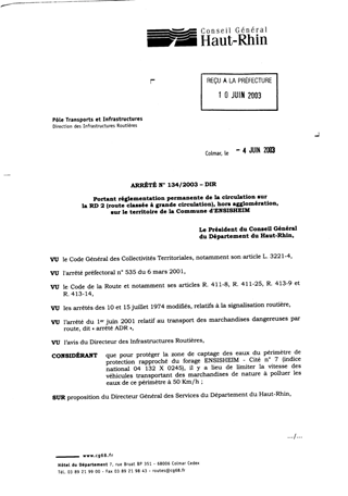 portant règlementation permanente de la circulation sur la RD 2 (route classée à grande circulation), hors agglomération , sur le territoire de la Commune d'ENSISHEIM. Resumé Pièces jointes ARRETE Assemblée : Non défini Date : 04/06/2003 Rapporteur : Non défini Collectivité : Conseil départemental du Haut-Rhin Direction : Non défini Service : Direction des Routes Domaine : Circulation Commission :