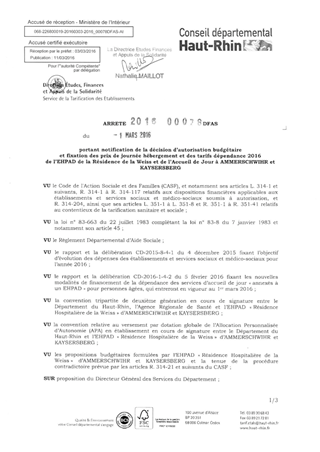 portant notification de la décision d'autorisation budgétaire et fixation des prix de journée hébergement et des tarifs dépendance 2016 de l'EHPAD de la résidence de la Weiss et de l'accueil de jour à AMMERSCHWIHR et KAYSERSBERG Resumé Pièces jointes ARRETE Assemblée : Non défini Date : 01/03/2016 Rapporteur : Non défini Collectivité : Conseil départemental du Haut-Rhin Direction : Non défini Service : Direction Etudes, Finances et Appuis de la Solidarité Domaine : Prix de Journée Commission :