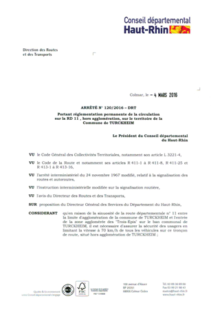 portant réglementation permanente de la circulation sur la RD 11, hors agglomération, sur le territoire de la commune de TURCKHEIM Resumé Pièces jointes ARRETE Assemblée : Non défini Date : 04/03/2016 Rapporteur : Non défini Collectivité : Conseil départemental du Haut-Rhin Direction : Non défini Service : Direction des Routes Domaine : Circulation Commission :