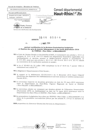 portant notification de la décision d'autorisation budgétaire et fixation des prix de journée hébergement et des tarifs dépendance 2016 de l'EHPAD "Père Faller" à BELLEMAGNY Resumé Pièces jointes ARRETE Assemblée : Non défini Date : 07/03/2016 Rapporteur : Non défini Collectivité : Conseil départemental du Haut-Rhin Direction : Non défini Service : Direction Etudes, Finances et Appuis de la Solidarité Domaine : Prix de Journée Commission :