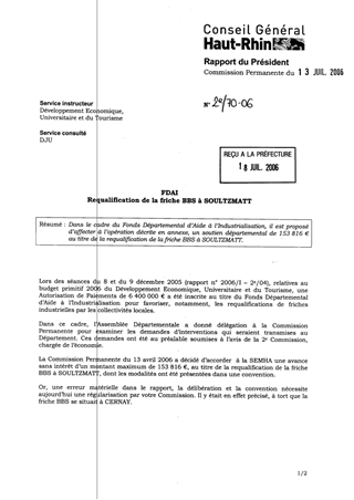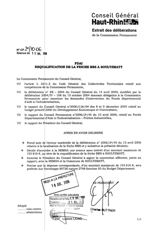 Dans le cadre du Fonds Départemental d’Aide à l’Industrialisation, il est proposé d’affecter à l’opération décrite en annexe, un soutien départemental de 153 816 € au titre de la requalification de la friche BBS à SOULTZMATT.