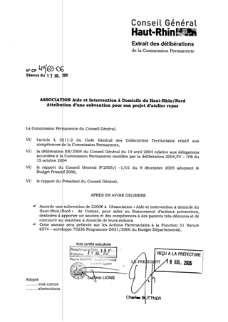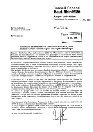 Attribution d’une subvention de 2200 € à l’Association « Aide et Intervention à Domicile du Haut-Rhin/nord » de Colmar pour participer au financement d’une action préventive, destinée à apporter un soutien et des compétences à des parents très démunis et de concourir au maintien à domicile de leurs enfants.
