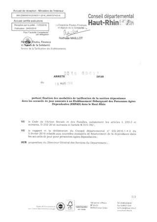 portant fixation des modalités de tarification de la section dépendance dans les accueils de jour annexés à un établissement hébergeant des personnes âgées dépendantes (EHPAD) dans le Haut-Rhin Resumé Pièces jointes ARRETE Assemblée : Non défini Date : 10/03/2016 Rapporteur : Non défini Collectivité : Conseil départemental du Haut-Rhin Direction : Non défini Service : Direction Etudes, Finances et Appuis de la Solidarité Domaine : Personnes Agées Commission :