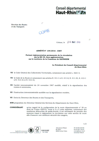 portant réglementation permanente de la circulation sur la RD 39, hors agglomération, sur le territoire de la commune de SAUSHEIM Resumé Pièces jointes ARRETE Assemblée : Non défini Date : 16/03/2016 Rapporteur : Non défini Collectivité : Conseil départemental du Haut-Rhin Direction : Non défini Service : Direction des Routes Domaine : Circulation Commission :