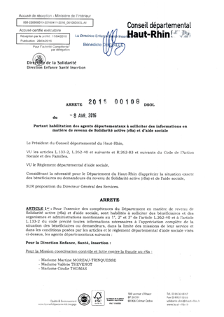 portant habilitation des agents départementaux à solliciter des informations en matière de revenu de Solidarité active (rSa) et d'aide sociale Resumé Pièces jointes ARRETE Assemblée : Non défini Date : 08/04/2016 Rapporteur : Non défini Collectivité : Conseil départemental du Haut-Rhin Direction : Non défini Service : Direction de la Solidarité Domaine : Autres (non classés) Commission :