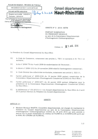 portant nomination du Président délégué au sein de la Commission Départementale d'Aménagement Cinématographique Resumé Pièces jointes ARRETE Assemblée : Non défini Date : 11/04/2016 Rapporteur : Non défini Collectivité : Conseil départemental du Haut-Rhin Direction : Non défini Service : Direction Europe Attractivité et Aménagement Domaine : Autres (non classés) Commission :