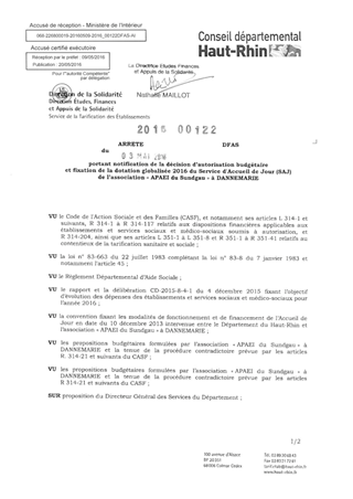 portant notification de la décision d'autorisation budgétaire et fixation de la dotation globalisée 2016 du service d'accueil de jour (SAJ) de l'association "APAEI du Sundgau" à DANNEMARIE Resumé Pièces jointes ARRETE Assemblée : Non défini Date : 03/05/2016 Rapporteur : Non défini Collectivité : Conseil départemental du Haut-Rhin Direction : Non défini Service : Direction de la Solidarité Domaine : Dotations financières Commission :