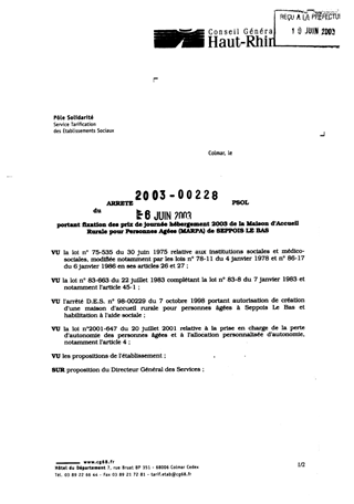 portant fixation des prix de journée hébergement 2003 de la maison d'accueil rurale pour personnes âgées (MARPA) de SEPPOIS LE BAS; Resumé Pièces jointes ARRETE Assemblée : Non défini Date : 06/06/2003 Rapporteur : Non défini Collectivité : Conseil départemental du Haut-Rhin Direction : Non défini Service : Service de la Tarification des Etablissements Domaine : Prix de Journée Commission :