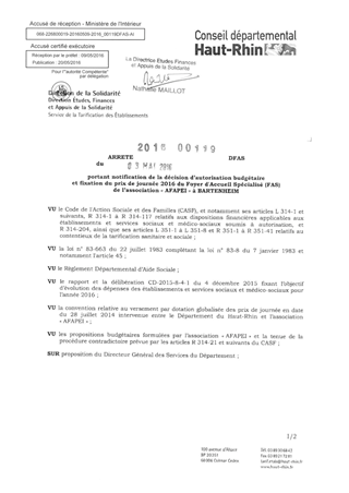 portant notification de la décision d'autorisation budgétaire et fixation du prix de journée 2016 du foyer d'accueil spécialisé (FAS) de l'association "AFAPEI" à BARTENHEIM Resumé Pièces jointes ARRETE Assemblée : Non défini Date : 03/05/2016 Rapporteur : Non défini Collectivité : Conseil départemental du Haut-Rhin Direction : Non défini Service : Direction de la Solidarité Domaine : Prix de Journée Commission :