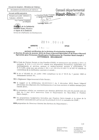 portant notification de la décision d'autorisation budgétaire et fixation du prix de journée 2016 du foyer d'accueil spécialisé et du foyer d'accueil spécialisé pour personnes handicapées vieillissantes de l'Institut Saint-Joseph à LUTTERBACH-BELLEMAGNY