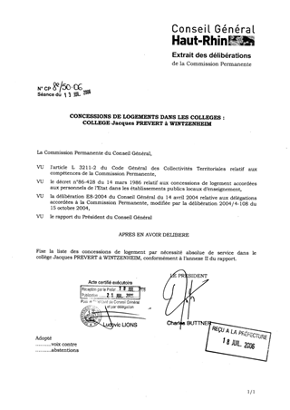 Le présent rapport a pour objet de soumettre à la Commission Permanente une nouvelle répartition des concessions de logement par nécessité absolue de service au collège Jacques PREVERT à WINTZENHEIM.